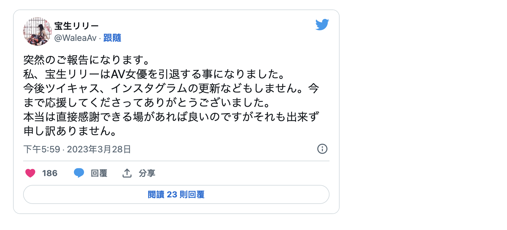 除了離開AV界,宝生リリー(寶生莉莉)也說未來不會再更新twitter及IG,只是因為無法舉辦活動向粉絲們面對面表達感謝之意,所以她只能藉著這篇引退文感謝大家長久以來的支持⋯