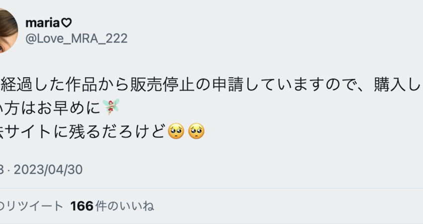 她在twitter上宣布,要把發售超過5年的作品下架了,請大家要買要快,不然以後只剩違法的網站才看得到了〜