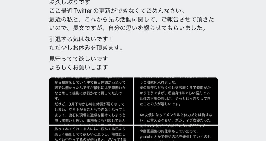 但今年她的狀況一直很不對勁,先是社群更新停滯,幾乎只轉推發片情報,然後從2月開始的活動通通宣告中止,當時就有不少AV情報站猜她快玩完了ー直到昨天,她終於在twitter發表長文,交代了自己的狀況:
