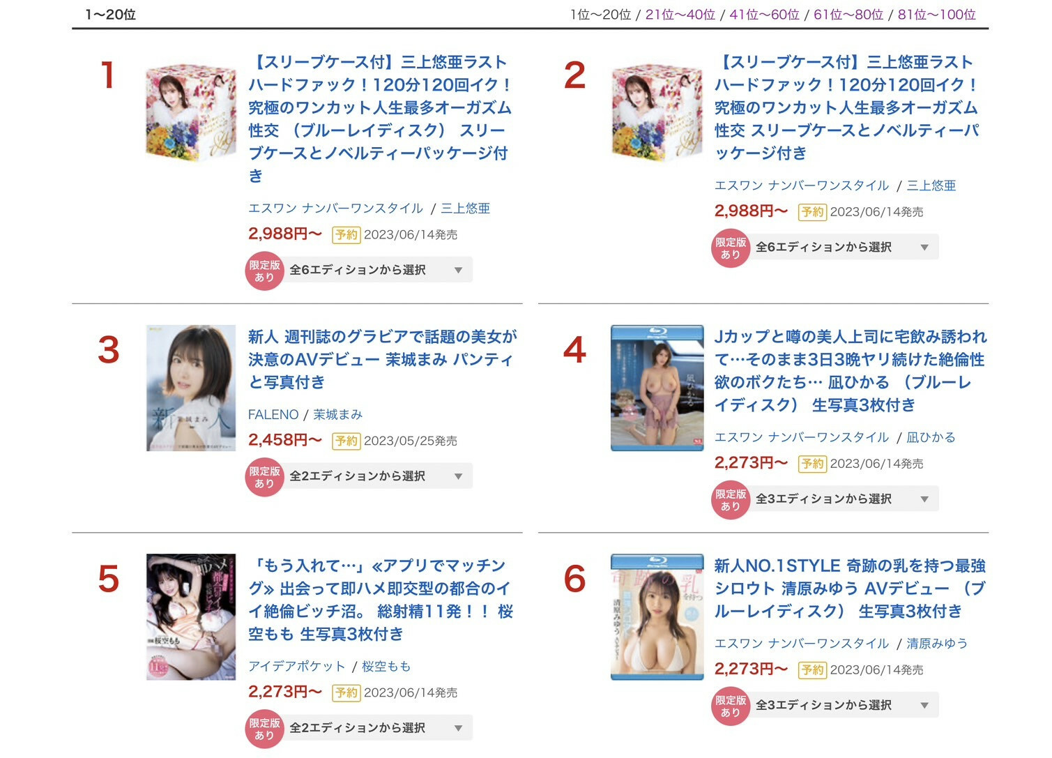 和一開始小弟的預言一樣,三上悠亜是無敵的,在打出「ラストハードファック(Last Hard Sex,最後的重口味演出)」口號加上精美包裝的特典版本後果然打遍天下無敵手,而凪ひかる(凪光)和清原みゆう(清原美優)也告訴我們「有奶就是娘」,在排行榜拿下非常優異的成績,那IP社呢?身為許多朋友心目中最好的偶像片商,IP社最賣的作品是哪一支?