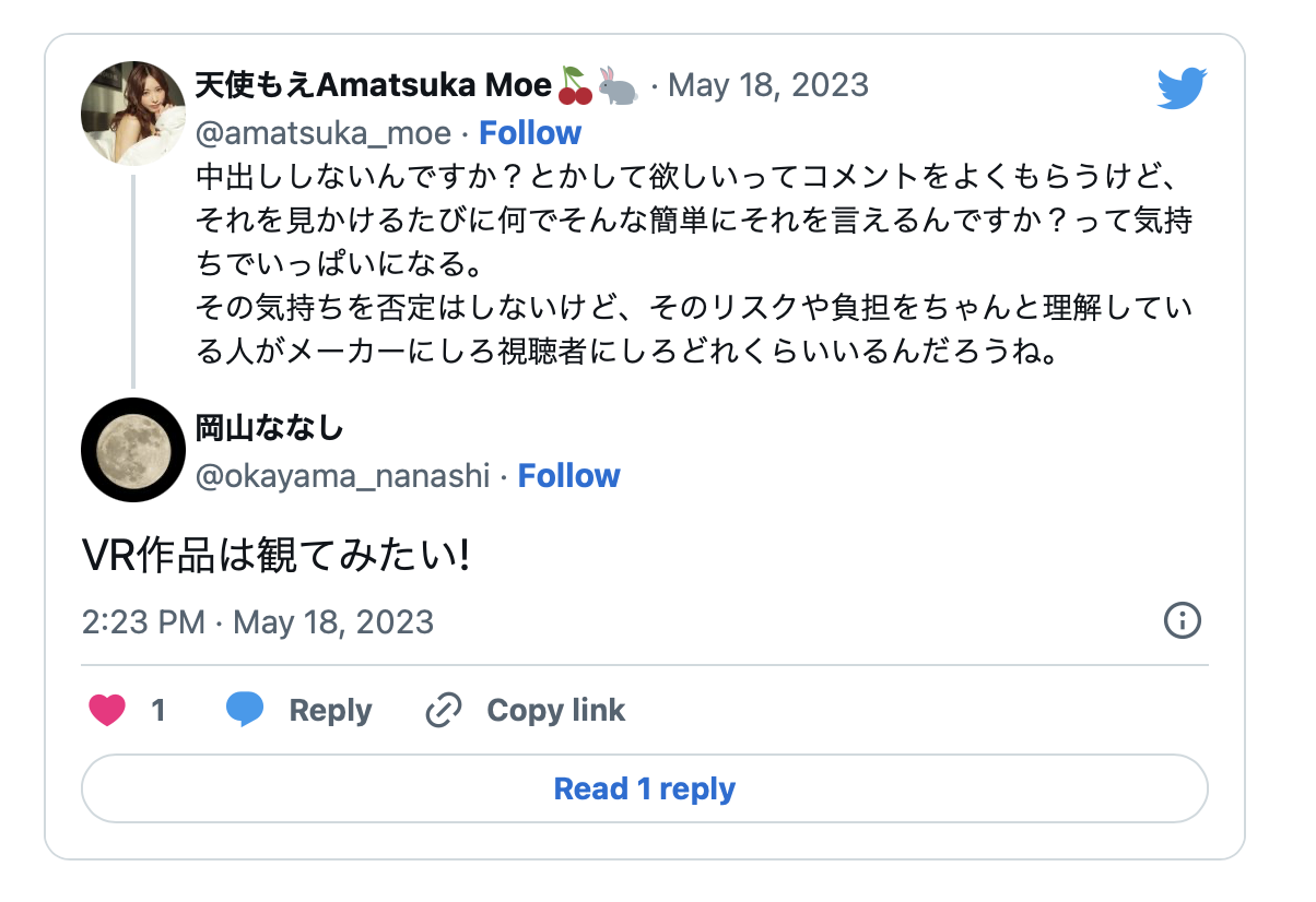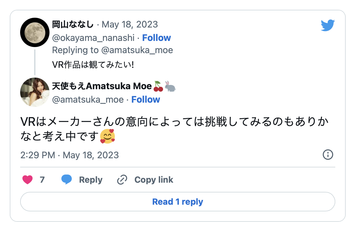 所以日本的AV情報站都以「朗報」來報導天使もえ(天使萌)的反應,不過也容我提醒大家,天使もえ(天使萌)所屬的片商FALENO STAR上一支VR片是2021年9月的事了,天使もえ(天使萌)是真的球來我就打還是知道FALENO STAR不會拍VR片所以有恃無恐就看大家怎麼想了⋯