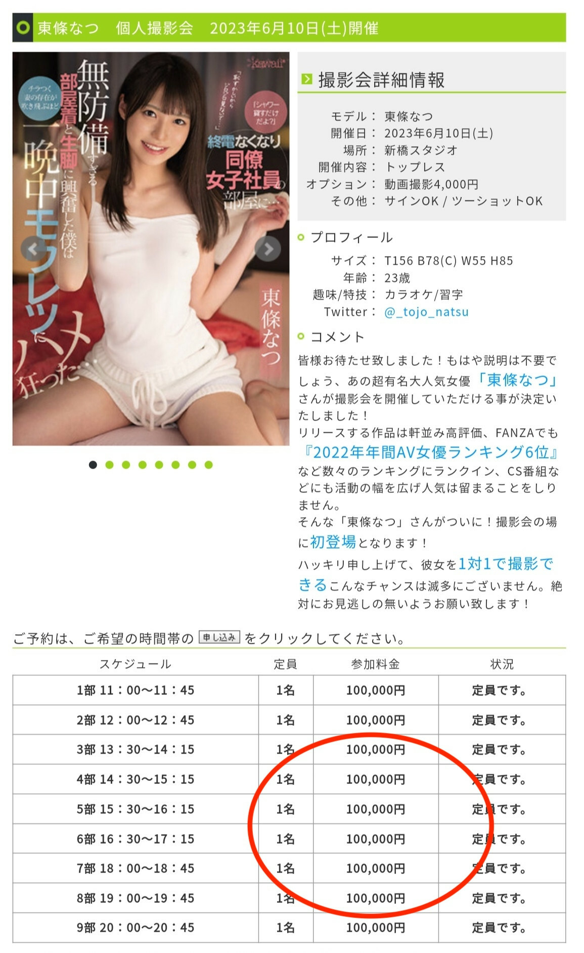 不過東條なつ(東條夏)倒是有嚇到我:Faleno Star專屬出道、中間轉為發片無限制的企劃女優然後現在又變成本中和ダスッ!(DAS)兩片商共同專屬女優的她不久前宣布要舉辦攝影會,一對一的方式每個名額要價100,000日幣(合台幣22,000元左右),這是我有在注意AV女優攝影會以來最高的價格!