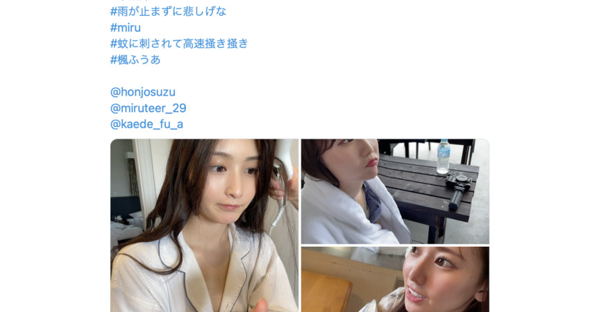 因為C-More的經紀人「A」剛剛在twitter發文,可以看到miru是和本庄鈴以及楓ふうあ(楓富愛)一起出外景進行拍攝工作,先不管她們去拍什麼,重點是文中不但標記了miru而且還有照片: