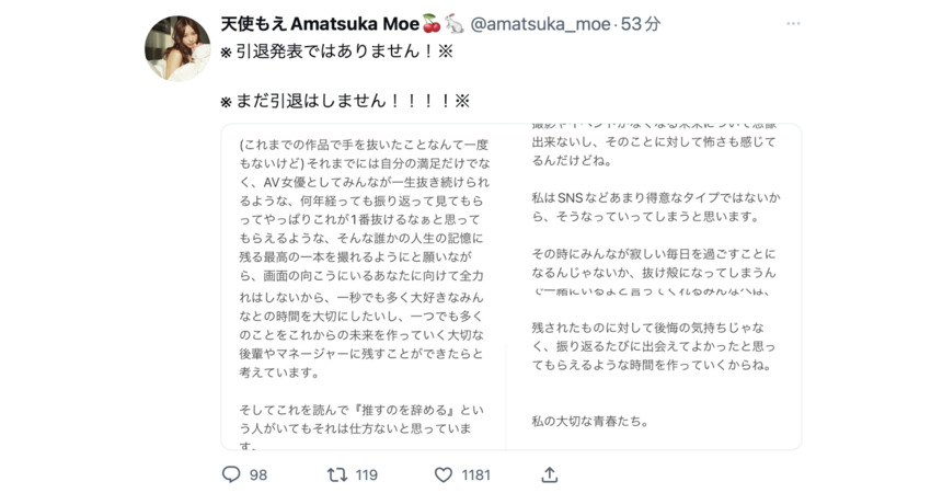 她會被擔心也是很正常的,儘管是FALENO STAR的一姐,不久前也完成了100支作品的里程碑,但是在這一行待滿九週年的她真的是資深到不行,在這個家有一老不見得如有一寶的業界一定會被討論什麼時候要引退;以天使もえ(天使萌)之敏感她肯定知道很多人關心自己的去留,所以她搶先發了這篇: