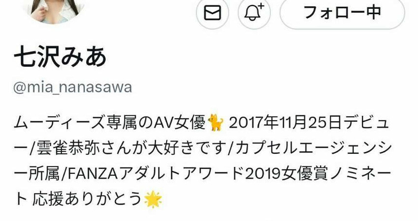 這也是繼三上、深田、桃乃木以及本鄉之後,第五位twitter追蹤破百萬的現役女優(當然,接下來三上就要退休了,七沢會再向上變成業界第四),這相當不容易的,因為twitter最近一直在清殭屍帳號,大家追蹤數字沒掉就不錯了,七沢みあ(七澤米亞)能一路衝上百萬追蹤,真的很厲害〜