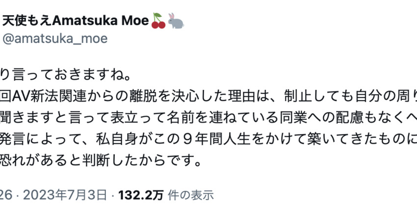 或許在那一刻天使就決定要遠離新法戰場了吧?只是和過去的戰友切割當然也有些副作用,有些人不解為何天使說變就變有些人則是不滿,於是天使的社群馬上炎上戰翻天,連同人AV這種非日本法律保障的業者都開一堆分身來戰,也才有所屬事務所BStar官推公告再有毀謗中傷就要提告了⋯