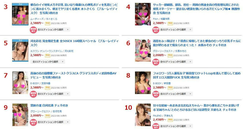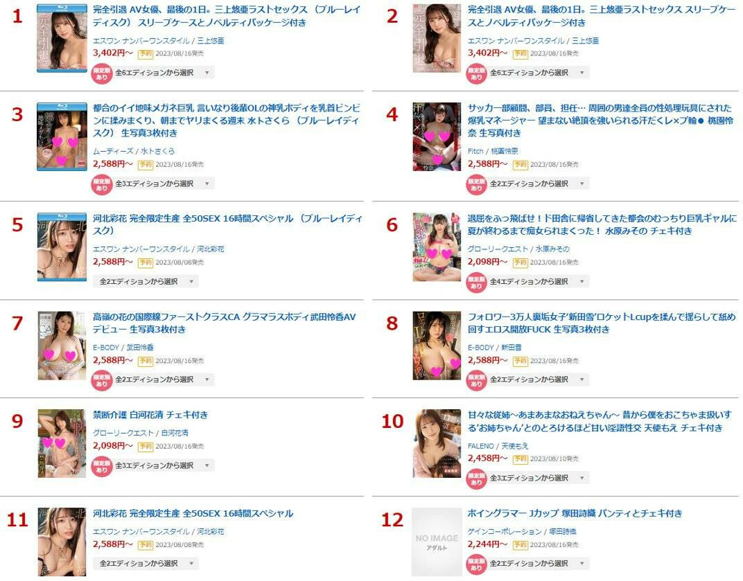 乾,這還有什麼好猜的?當然是發表引退作的「三上悠亜」,甚至可以這麼說,假如她沒拿到第一的話那S1上從導演下到作品企劃通通都要土下座謝罪;除此之外呢?首先,河北彩花是真的超強,很多女優是發新片力爭上游,她卻只用精選輯就把大家打爆,藍光第5加上DVD第11的成績看似還好,但別忘了她並不是這一檔發片的人喔,這成績應該會讓很多女優懷疑人生;再來,水卜さくら(水卜櫻)和桃園怜奈還是很穩定,E-Body的新人則是最成功⋯