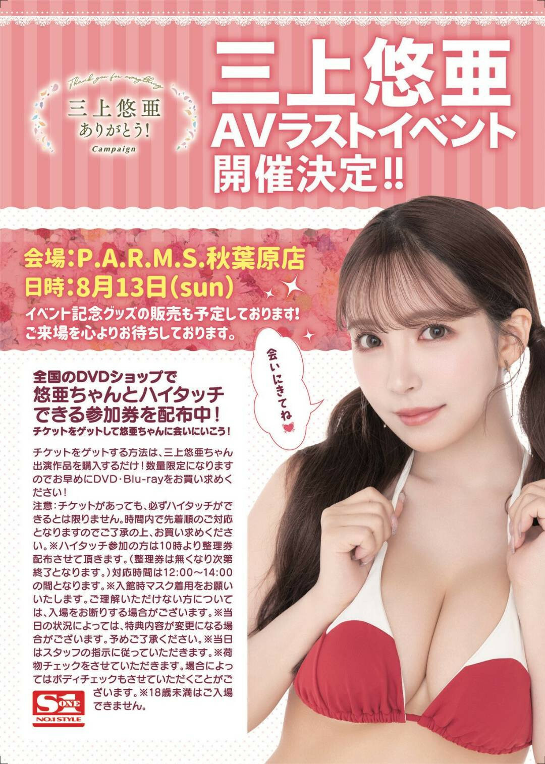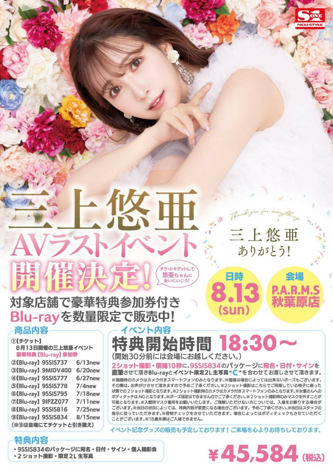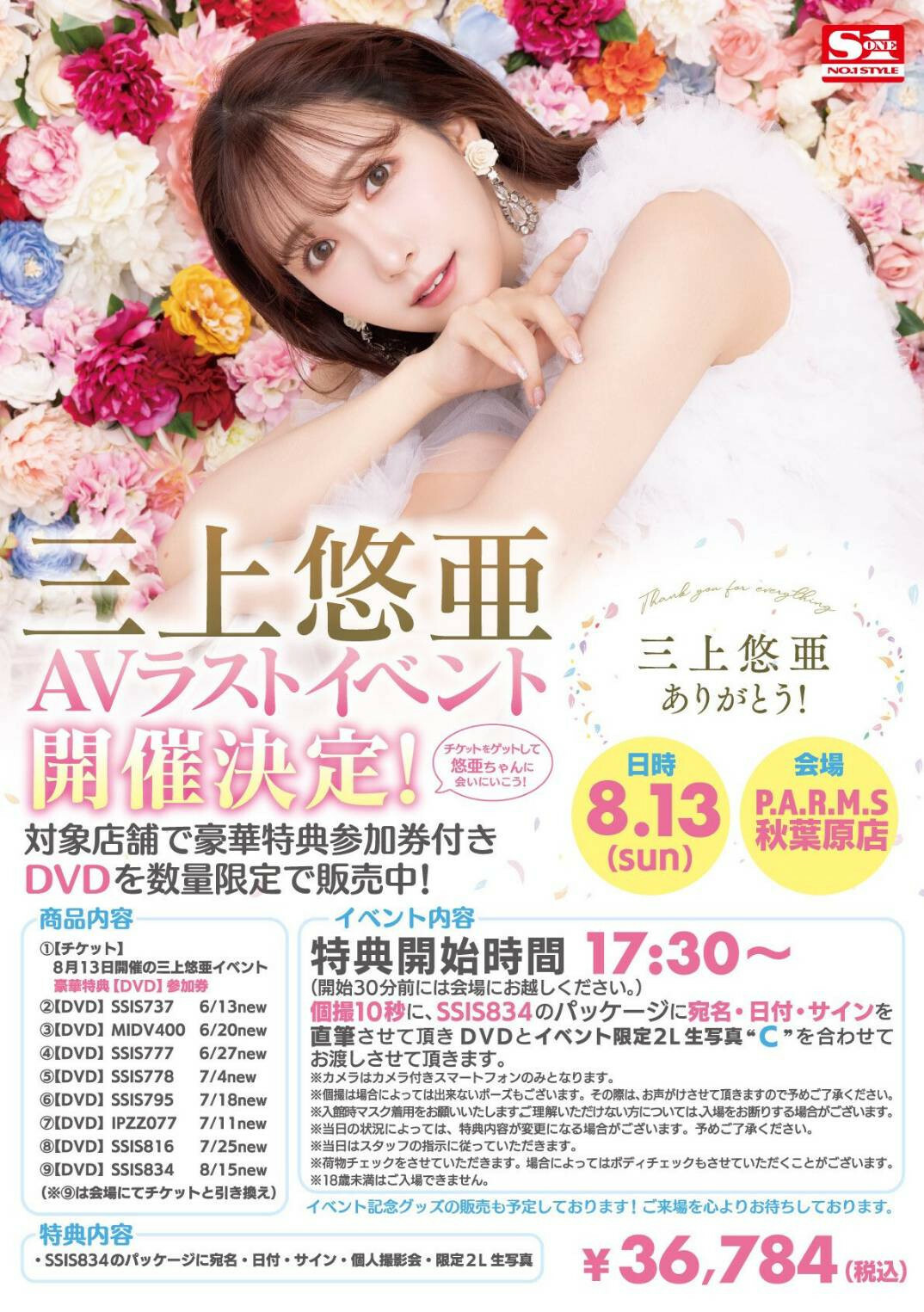 除了參加券之外還強迫購買SSIS-737、MIDV-400、SSIS-777以及SSIS-778四支作品,攝影會不得錄影,結束後可以和三上擊掌,最後還可以拿到活動限定生寫真「A」,售價18,392日幣(約台幣4,100元)。