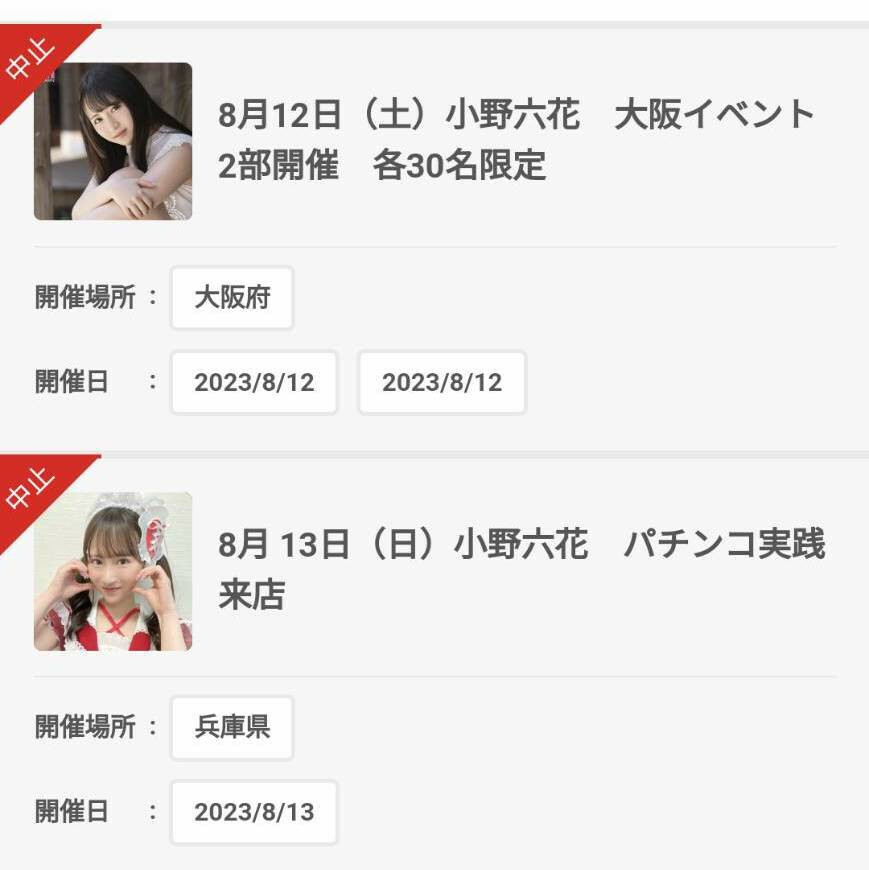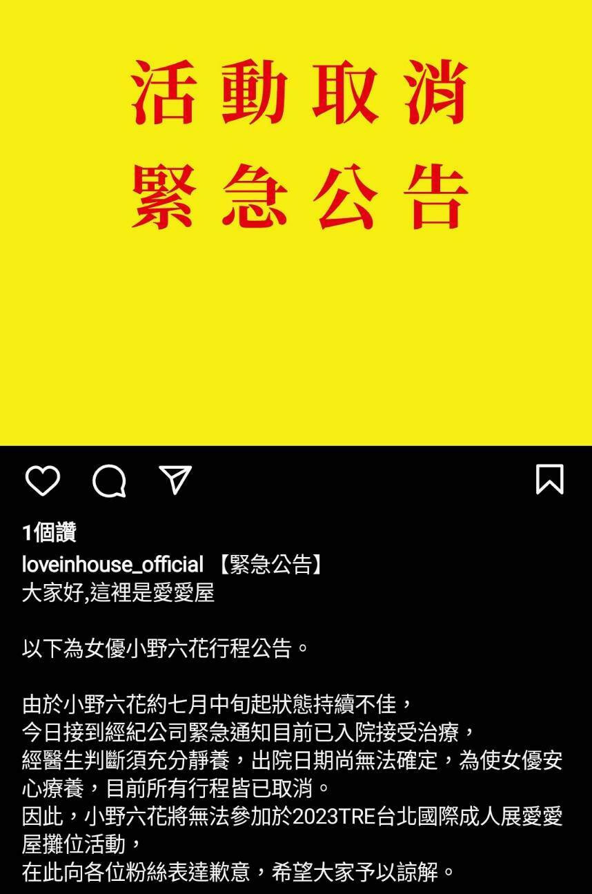 到底是什麼事這麼嚴重?讓小野六花必須「取消」活動而不是延期?因為一般女優沒有辦法完成活動多半會選擇延期再辦,小野六花用取消的方式代表她本人及事務所都不認為短期內有辦法回來,我猜很多人腦袋裡都浮現兩個字ー