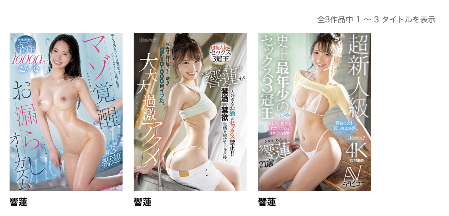 本中這家片商很好判斷,在側標就直接會標明女優的身分,像響蓮只被標了「解禁」那就意味著絕對不是專屬,發完片子就要走了ー看著出道作封面上的「大型新人」、看著這支解禁作文案第一句話就寫說這是「【超新人級のセックス3冠王×中出し】」我突然覺得有點諷刺,片商一面說她超棒的一面卻把她當快餐用,用完就要丟了〜