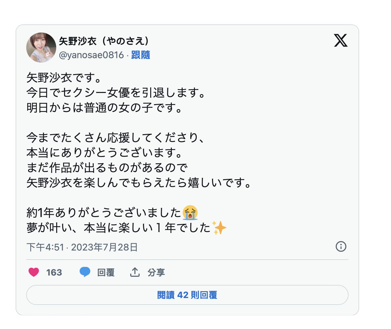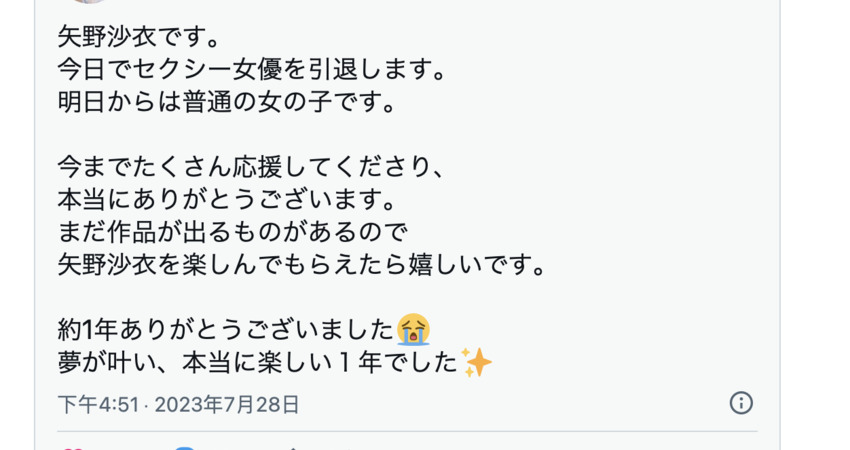好快,一年過去了,好快,矢野沙衣宣布引退了。