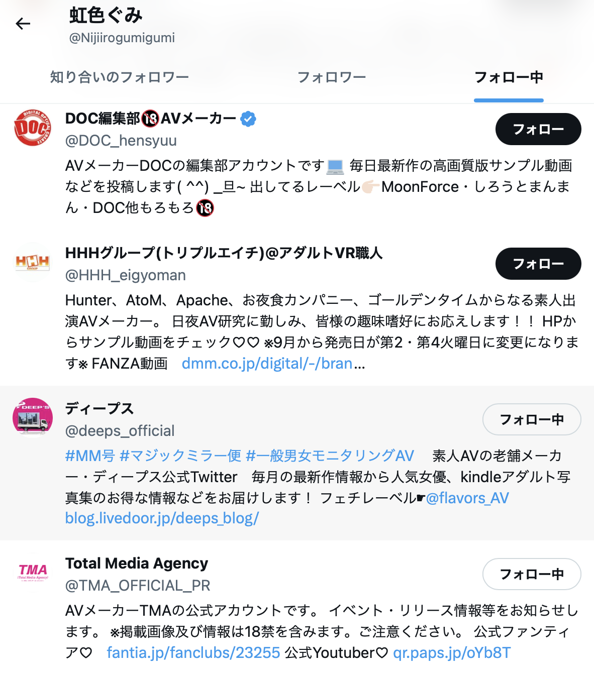 因為她存在感真的太低了,到現在twitter(就X)還不滿千人追蹤,以頂尖片商的專屬女優而言實在太邊緣了,現在她又完成了6支作品的發片門檻,然後各位可以去看看她twitter(X)追蹤的名單: