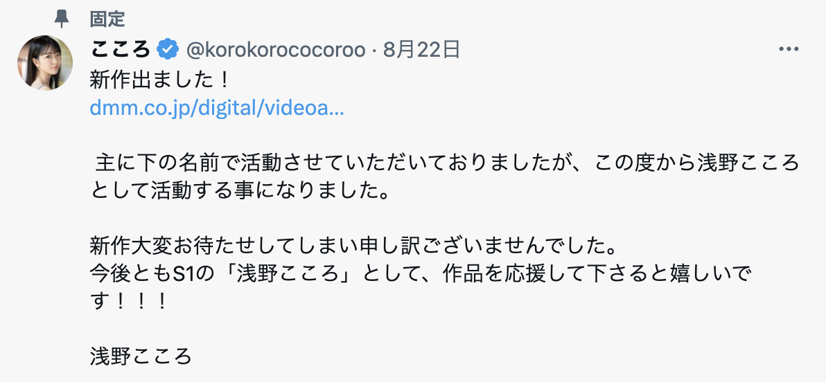 昨天看到作品情報時我以為是S1打錯了,但後來看了官網和Fanza(DMM)全都獨立建了浅野こころ(淺野心)的欄位我就知道這不是名字打錯,再加上事務所BStar之前宣布她OFF會的時候就沒有再叫她歌野こころ(歌野心)了,所以就是她改名字了⋯