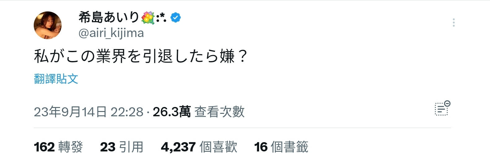 這話講得直接,完全沒有曖昧空間,意思就是直接問影迷了「如果我從業界引退了、你們會不開心嗎?」;闖蕩AV界多年,相信大家都知道像希島這樣的大型女優不會是影迷決定生死ー意思就是她事情不少,是兩家片商的專屬女優、曾參加偶像團體、會單獨開演唱會然後現在還成了作家,一般來說這種女優如果引退大多是自己不想幹,不是因為沒人愛了只能黯然離去⋯