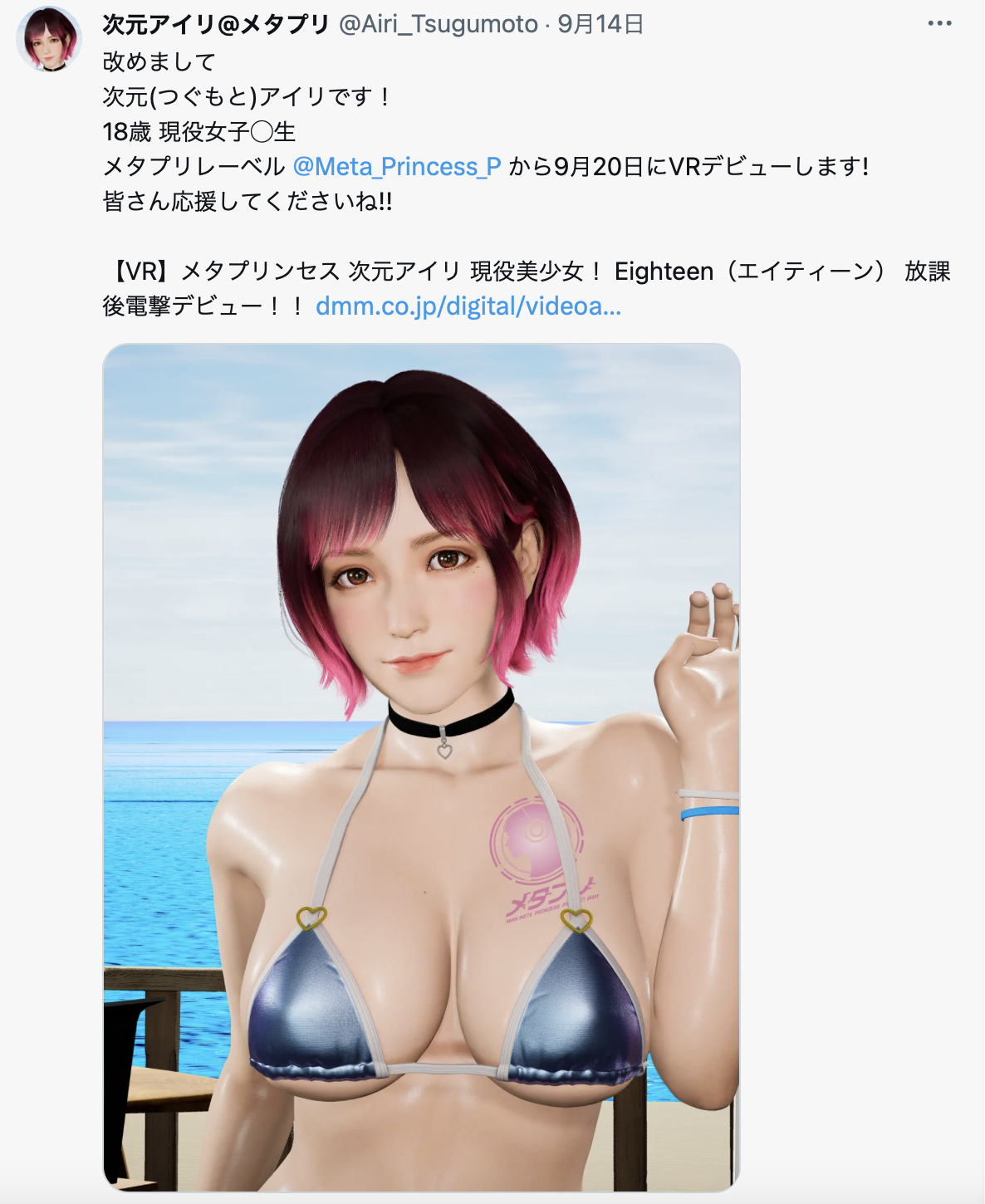 我覺得答案是肯定的,因為成人影片市場本來就不限於真人演出的AV,要看的只是AI這一塊能搶走多少市場;而隨著作畫技術的成熟以及現在Vtuber流行,日本現在也出現了一家新廠商「メタプリ」有了這麼一支作品「【VR】メタプリンセス 次元アイリ 現役美少女! Eighteen(エイティーン) 放課後電撃デビュー!!」:
