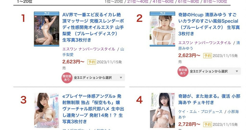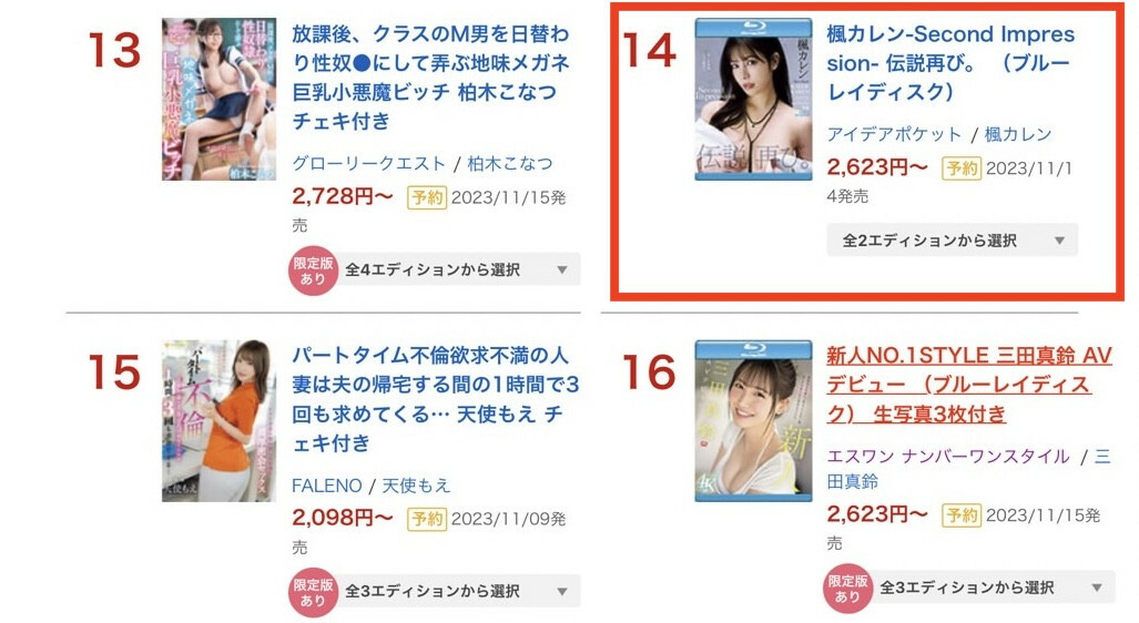 這是昨天Fanza(DMM)實體片的通販銷售排行榜。