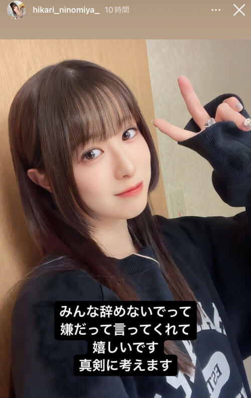 而在看完大家的回應後,二宮ひかり(二宮光)又PO了限動說「既然大家都說不想看到我引退」、「那我就好好再考慮一下(引退的事)」:其實她話沒講死,沒說不退了也沒說還是要退,我個人覺得應該不會退休,希望她不要打臉〜