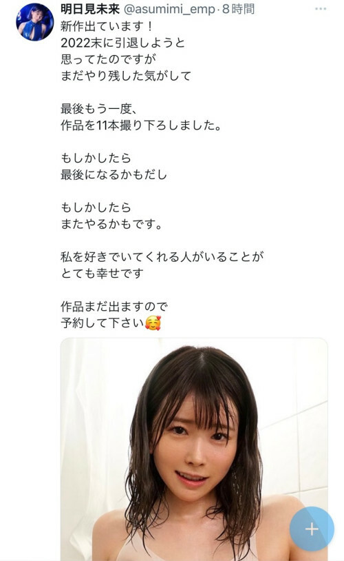 而除了二宮ひかり(二宮光),目前讓大家最擔心的就是之前參加TRE台北國際成人展的明日見未来(明日見未來)社長,她在X(twitter)明白寫了,原本在2022年年底的時候就要引退,後來覺得還有些事情沒有完成於是加演了11支作品,現在正在思考要不要繼續走下去⋯