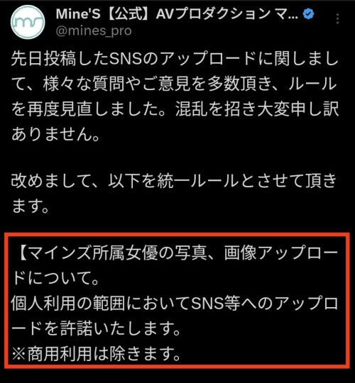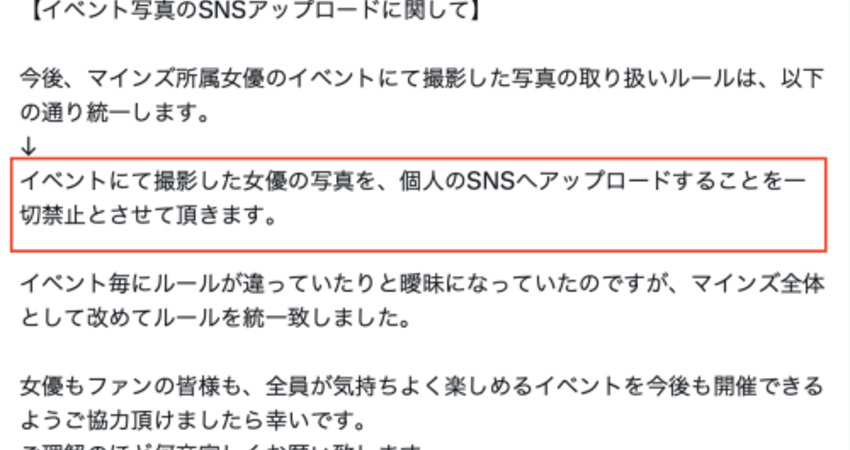 經紀公司マインズ(Mine’s)在聲明中是這麼說的:從現在開始,所有マインズ(Mine’s)所屬的女優參加的活動一律禁止影迷將照片上傳到自己的SNS(社群)上ー是,也就是說不管是參加見面會還是攝影會,你還是可以照規定拍得很開心,只是照片就只能放在自己的相機、手機或電腦上來看,想要上傳到X(twitter)、IG、臉書或是其他的社群網站是不行的〜