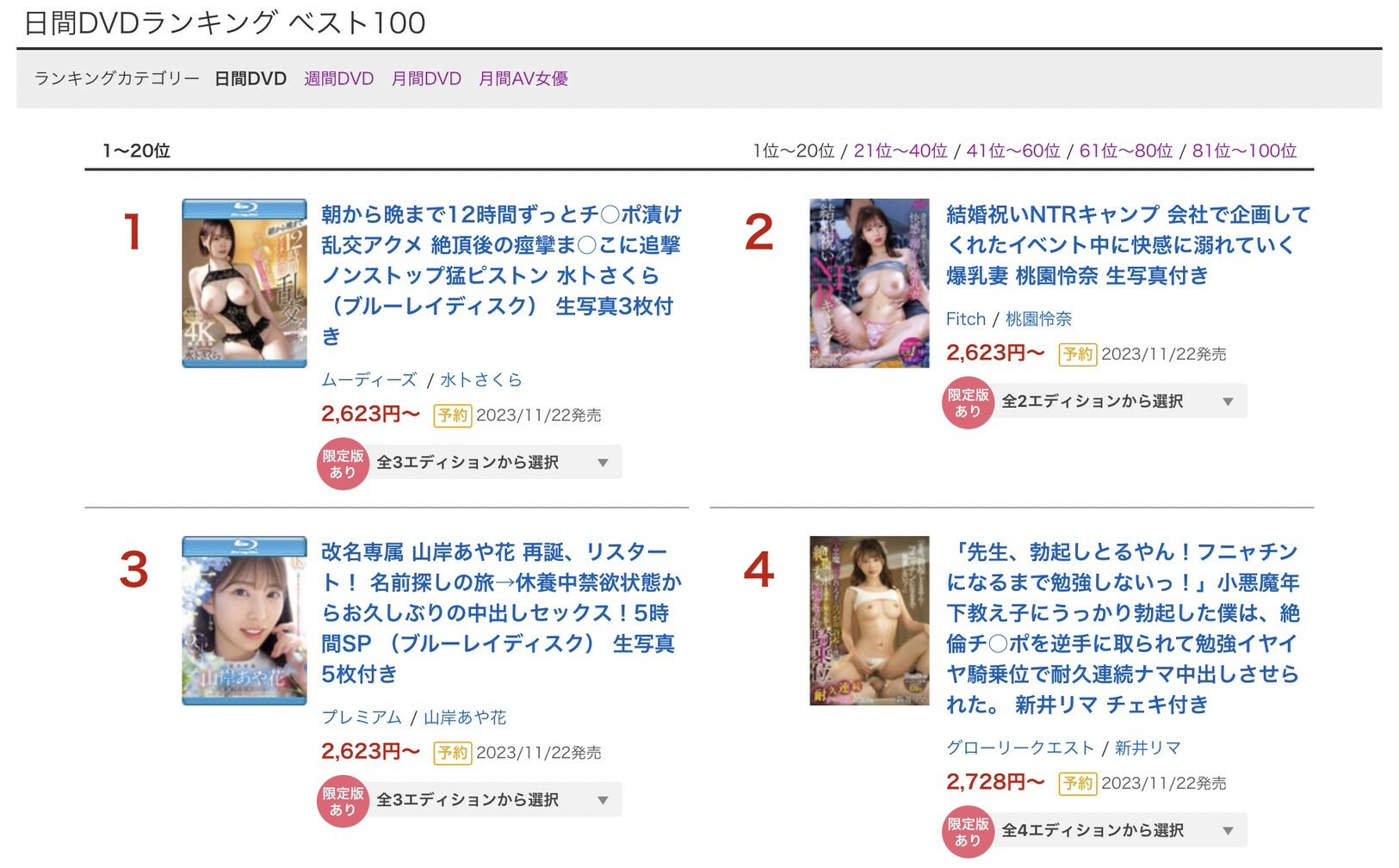 這是昨天FANZA(DMM)的單日銷售排行榜。