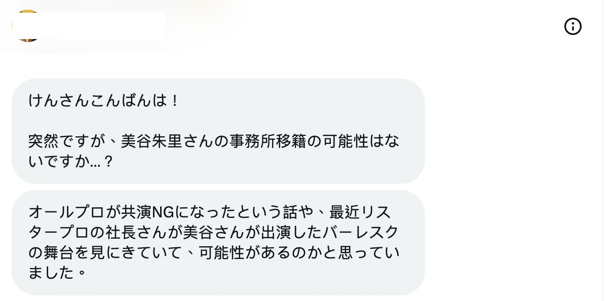 理由是山岸あや花(山岸綺花)公開現身去看了美谷朱里在バーレスク的表演(就是現在社群上最後更新的那些影片),由於美谷所屬的事務所AllPro目前處於被其他八間經紀公司抵制的狀態,山岸公開現身被認為有重大的意義ー如果不是山岸夠義氣不管女優不能同台的禁令、就是美谷跳槽換事務所了對吧?