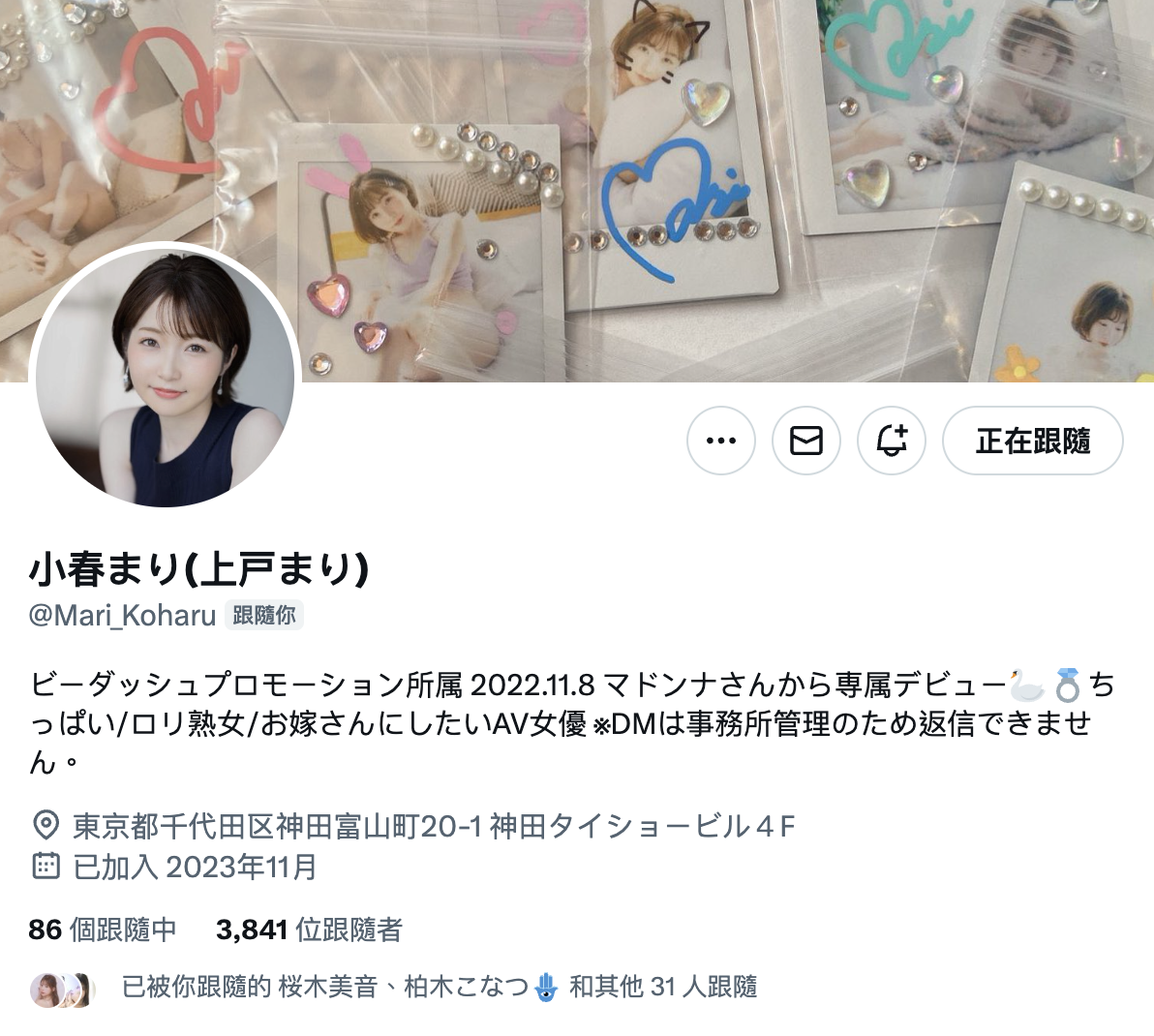讓我們來複習一下女優更換事務所會碰到的狀況,首先就是藝名能不能保留?天底下沒有自己的員工被挖走會爽的,所以女優如果要保留原有的藝名是非常不容易的(而且常常要付出讓前東家抽成的代價),如果女優和原事務所的關係不錯,那通常可以保留藝名的一部分,所以這位女優從上戸變小春然後都叫まり(真理)算是好事一件;再來,更改了事務所也要看社群能不能延續使用,上戸まり(上戶真理)已經說了,原先將近五萬人的X(twitter)將會刪除,請大家去追蹤她新的X(https://twitter.com/Mari_Koharu):