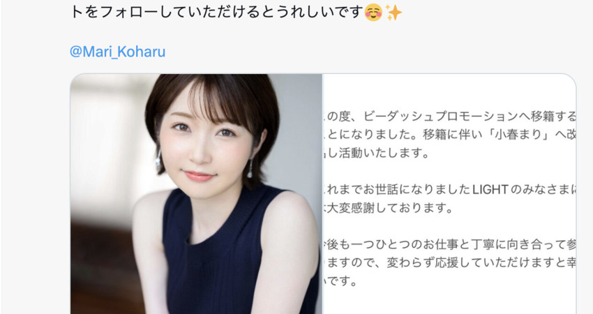近來最有名的例子就是美谷朱里,由Cruse Group跳槽到AllPro的她不久前又更換事務所為LiStarPro,也將藝名改為「美谷朱音」;而今天,有另一位女優「上戸まり(上戶真理)」宣布要從原先的事務所LIGHT跳槽去ビーダッシュプロモーション(B-Dash Promotion),名字也要改成小春まり(小春真理):