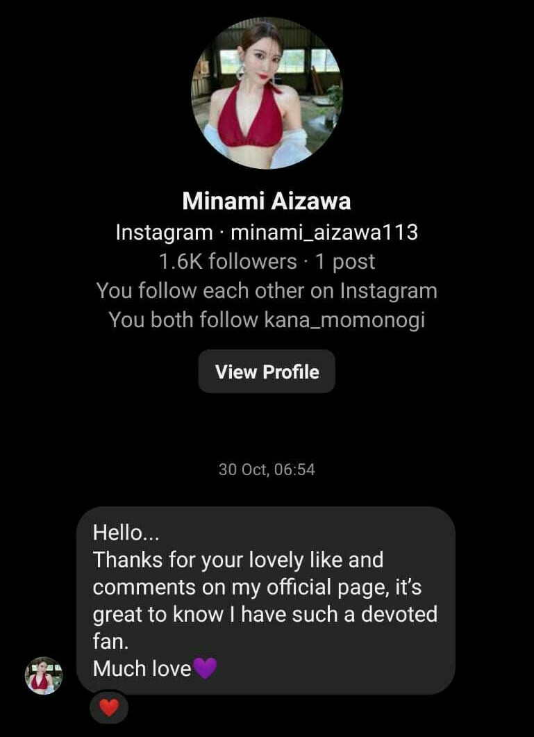 這是某位讀者來信投書,我們先來講一下他的基本資料,他是相沢みなみ(相澤南)的忠實粉絲,不過因為工作很忙,所以他從來沒有參加過活動,每天就是在網路上看她的社群發文按讚;有一天,他突然發現自己在IG上被「minami_aizawa113」追蹤,對方還敲他說感謝長久以來的支持: