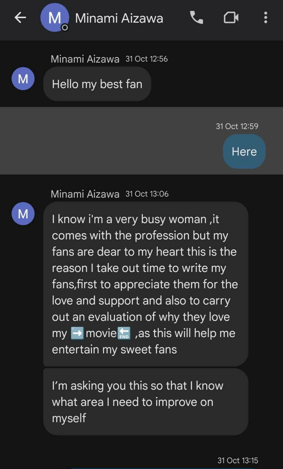 對,看了帳號就知道是假的,不過這位鐵粉還是禮貌性地回覆對方說謝謝,雙方就用英文來回聊了一陣子ー沒多久,這位「minami_aizawa113」要求改用Google Chat來聊天,雖然知道引退的相沢みなみ(相澤南)絕對不會花那麼多時間和粉絲聊天,但這位鐵粉還是想知道對方到底想幹嘛,所以雙方就繼續聊下去惹ー