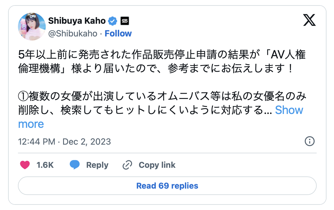 這件事現在有後續,Shibuya Kaho在X發文,目前是有3種狀況: