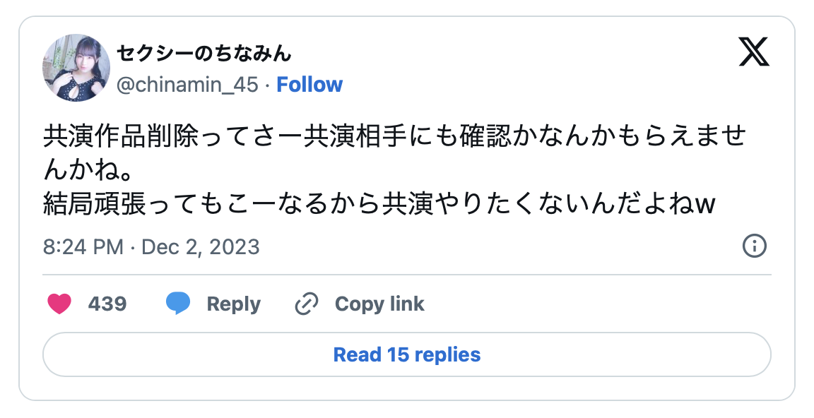 我再一次表達立場,對Shibuya Kaho下架作品我沒有任何意見,但看不順眼的人可不只哈比人男優にしくん(西君)一個,另一個女優桜ちなみ(櫻千奈美)就在自己的X上這麼說: