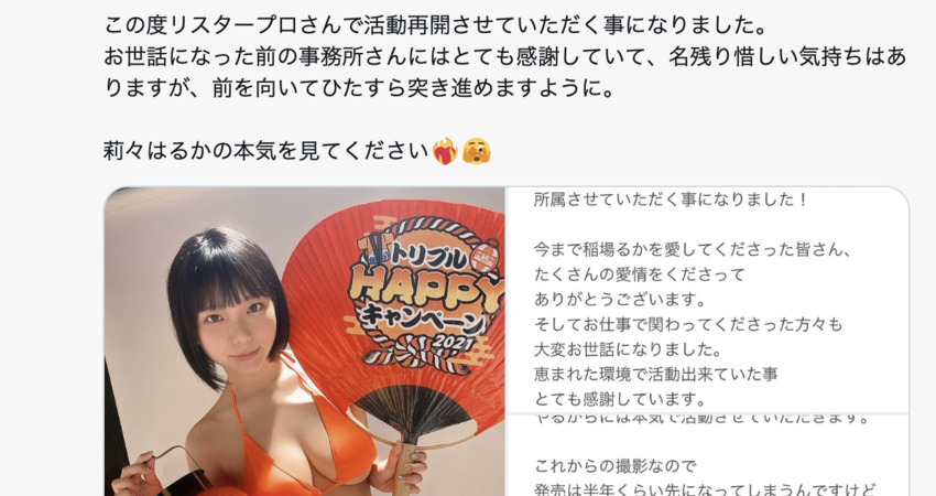 只是和美谷朱音一樣,稲場るか(稻場琉花)也沒守住原來的藝名,只能改名為莉々はるか(莉莉遙香),這其實很可惜,因為稲場已經引退好一陣子,重回戰場非常需要過去的知名度加持,但沒辦法,為了避免被外界說是AllPro和リスタープロ(LiStarPro)私下協議把女優整團打包送走,稲場るか(稻場琉花)只能砍掉重練惹: