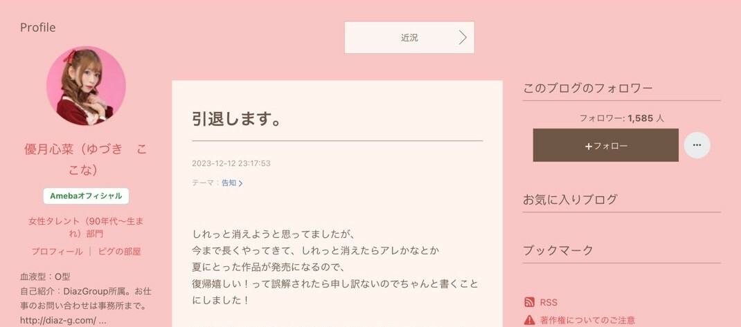 這⋯看了叫人蠻難過的,雖然從文章中看不出是Diaz Group沒辦法替優月心菜找到工作還是優月心菜真的很不妙大家都不要,但我們完全可以明白這一行有多麼殘酷ー明明該是很開心的再會,結果優月心菜卻告訴大家這是再也不見的再見,結局來得如此之快而又這麼突然真叫人措手不及〜