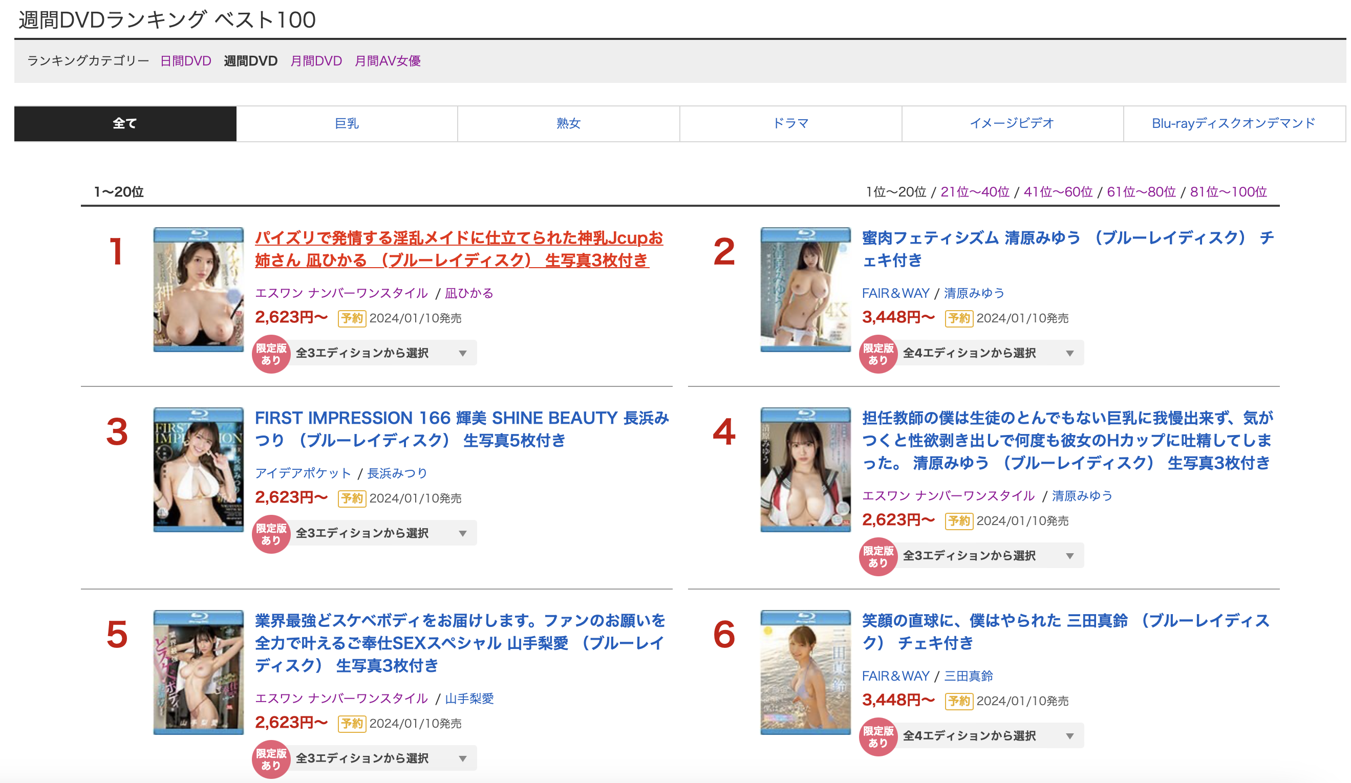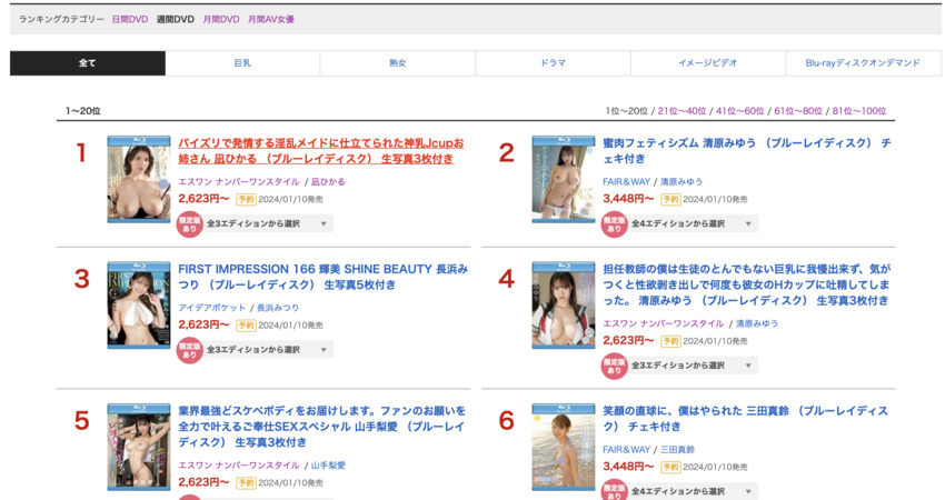 這是本週Fanza(DMM)的實體DVD銷售排行榜。