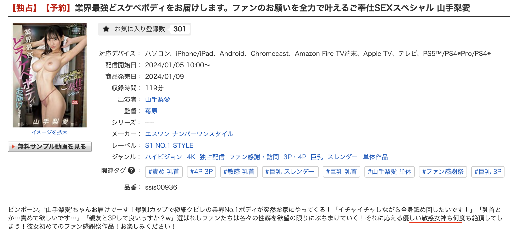 所以,真的,不要再說山手梨愛安靜無聲不會叫了,現在連片商都認證她是個過度敏感的女優,包括表情、包括叫聲以及超敏感的扭動現在她都有平均以上的水準,再搭配腹肌愈來愈明顯奶子也愈來愈大的身材,我覺得她就是這一行身材最像二次元動漫女公仔的女優ー不過她的硬體條件都這麼強了,這支作品在本週銷售排行榜卻沒有拿下第一,就不知道是因為作品騙很大還是她的人氣已經下滑?