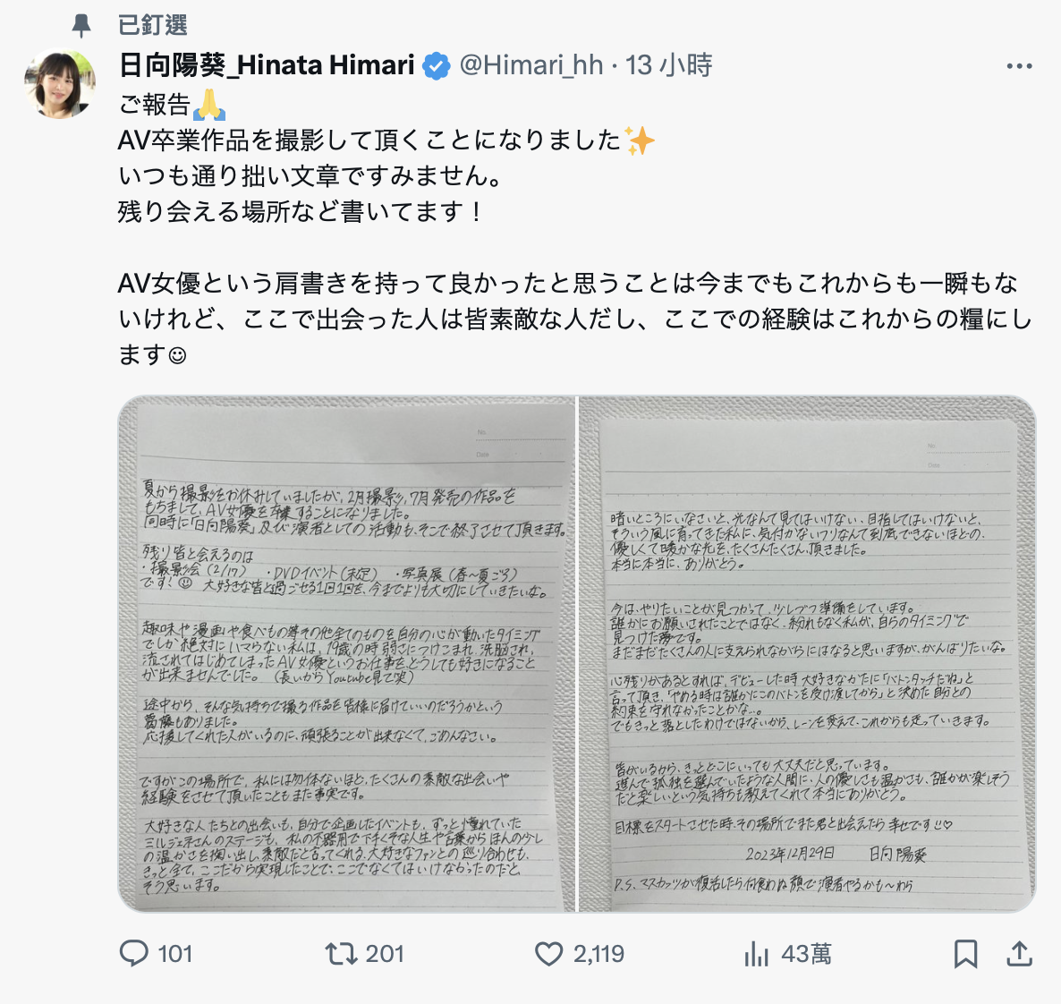 好吧,如此一來日向陽葵的動向就確定了,我覺得她很夠意思了,從這陣子在社群的發言就知道她對AV界沒興趣了,而在公布AV畢業的長文中她也提到自己從來沒有喜歡過AV女優這分工作,但運氣很好的是在這一行遇到很多好人好事,讓她可以待了這麼久;至於畢業的最主要原因是找到自己想做的事,不過在AV女優的工作還沒結束前她口風很緊,只說還在準備中,希望之後大家繼續支持她: