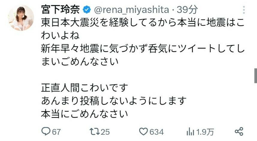 很明顯地,她已經被社群帶來的負面能量壓垮,就我的看法,祝大家新年快樂沒什麼不對,刪不刪文都沒關係,不過從宮下刪了文還一直「ごめんなさい(對不起)」就知道她過於在意那些批評她的人了ー與其這麼痛苦我覺得遠離社群也好,如果從此退出社群也沒關係,只要她快樂〜