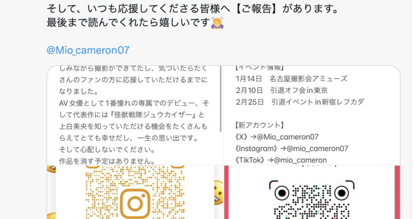 上白美央說不會下架作品,請不要擔心,另外,想見面也沒問題,她還是會繼續在レッドドラゴン(Red Dragon)陪酒,只要預約就可以了;但因為要退出原先的經紀公司LIGHT,所以她將會刪除所有的社群,所以在這裡要請大家追蹤她新的X帳號: