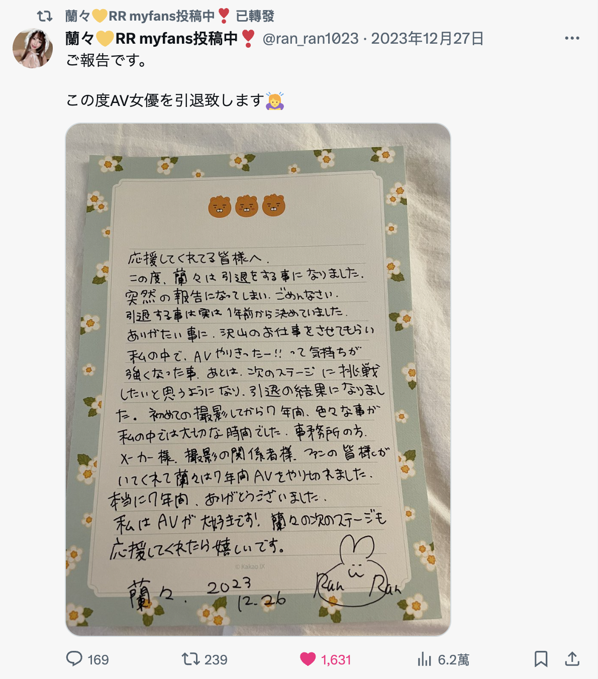 對,她的藝名就叫蘭々,不是之前叫蜜美杏的那位長身女優「藤井蘭々」ー她是手寫公開信宣布了引退的決定,信中提到引退是一年前就做好的決定,雖然這一年她收到了很多工作邀約覺得非常滿足,但人生還是該往下一個階段邁進了⋯