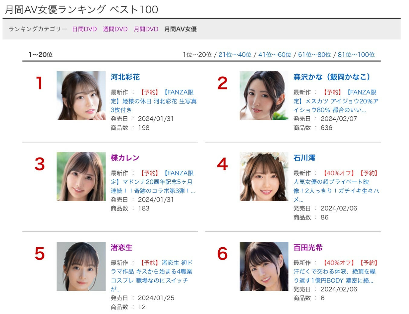 再來就是銷售了,撇除第一支作品的新人效應,百田的第二支作在FANZA實體銷售排行榜的表現仍然很不錯,12月排行第9,AV女優累積銷售排行第6;新片上架後本週排行榜18和19(藍光版和DVD版)雖然略有下滑,但第二支作品的買氣還是不錯,一者排行24(DVD)一者是第67名(藍光),以近來新人和強片之多,我認為百田的表現應該符合Moodyz的預期,不是雷聲大雨點小: