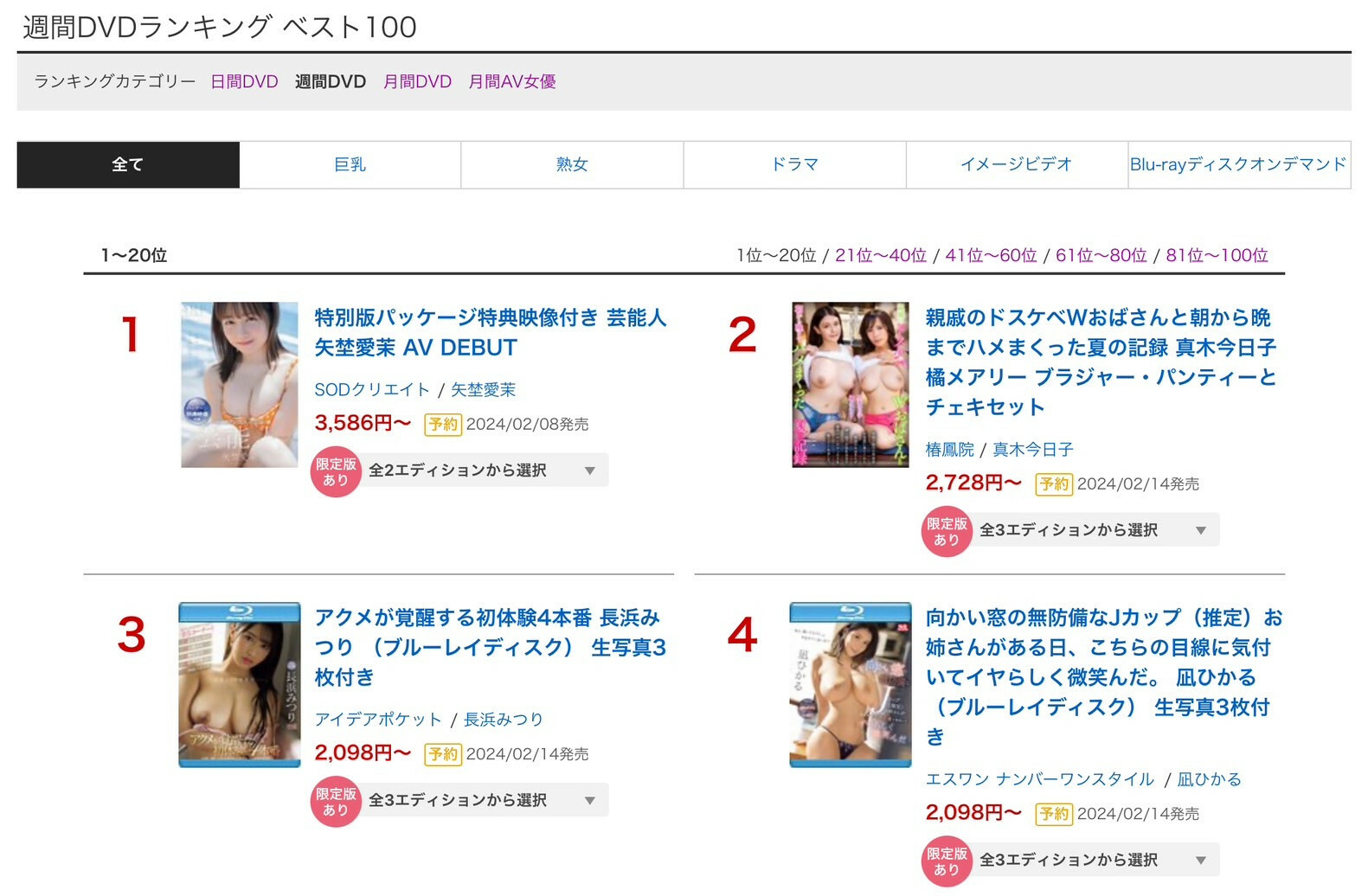 果然,一如預期,SOD STAR的新人「矢埜愛茉(原 前田美里)」順利拿下第一,藝能人的招牌實在好用,倒是第二名的作品蠻有趣的,如果大家不健忘的話應該記得矢埜作品剛上架的第一天並沒有拿下銷售冠軍,擋在她前面的就是這片,由橘メアリー(橘瑪麗)和真木今日子演出的「親戚のドスケベWおばさんと朝から晩までハメまくった夏の記録」: