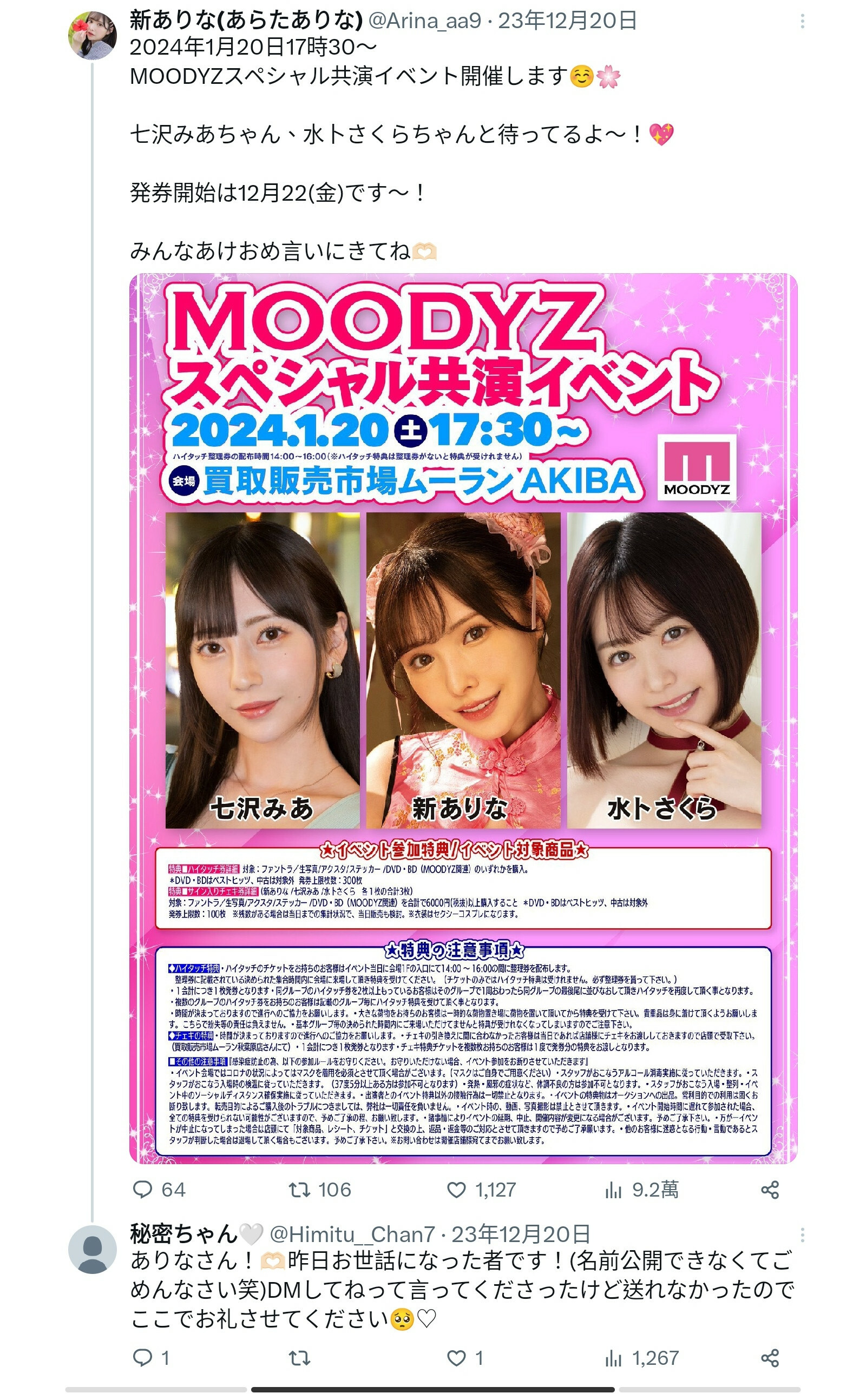 秘密醬已經在某個場合與事務所的大姊大新ありな(新有菜)見過面了,因為新醬沒有開放X私訊,所以她是直接留言感謝前輩的照顧
