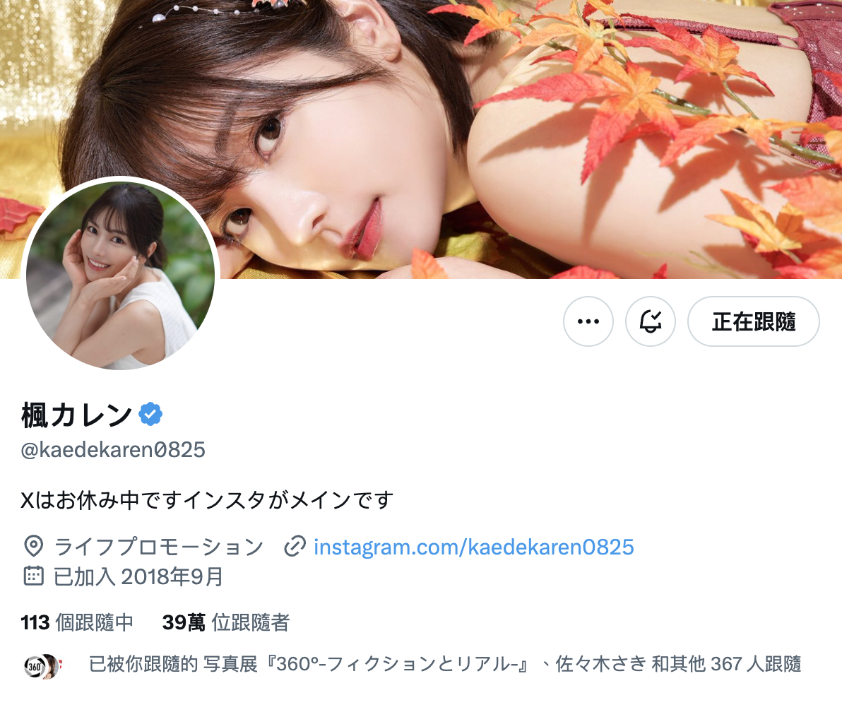在TSE台灣寫真博覽會舉辦得如火如荼的時候,我的社群也快被灌爆,因為知名的美女女優「楓カレン(楓花戀)」清空了X(https://twitter.com/kaedekaren0825),什麼都沒了⋯