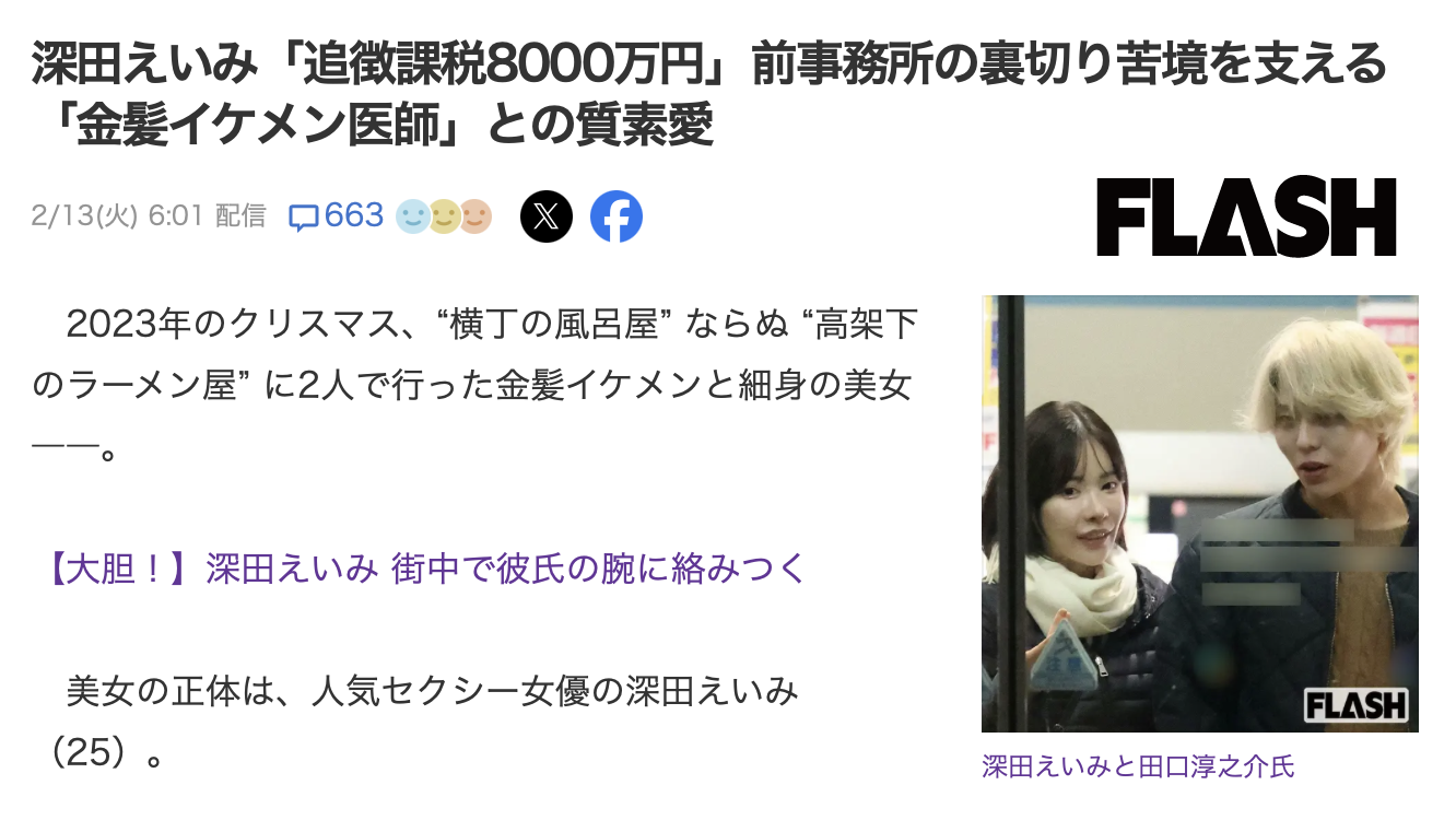 這次又發生了什麼事?原來她被拍到談戀愛了ー照片上那位金髮帥哥是個在醫美診所上班的醫生也是個油土伯(Youtuber),報導中說兩人是一年半前認識並且交往的:雖然之前深田えいみ(深田詠美)曾因為「約會就該男方買單」的發言導致社群炎上,不過就狗仔們的觀察是她與男友都過得很省,幾次約會看下來雙方都沒花什麼錢⋯