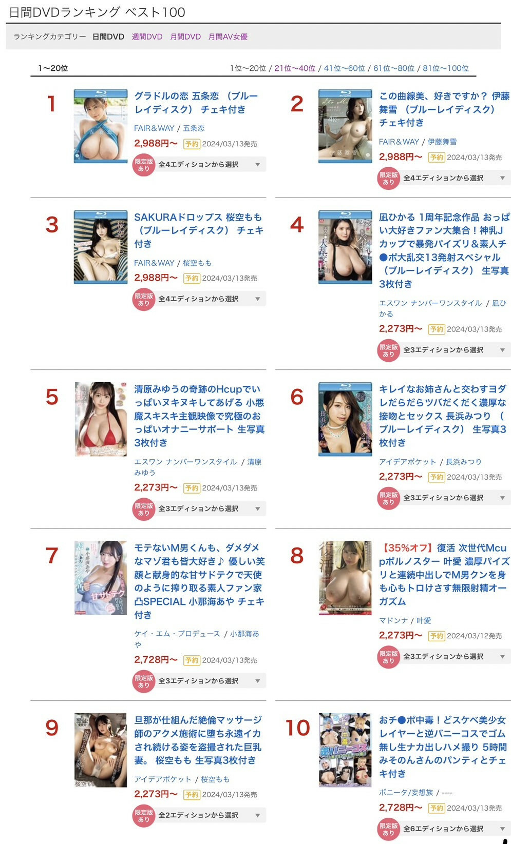 這是昨天Fanza 的銷售排行榜。