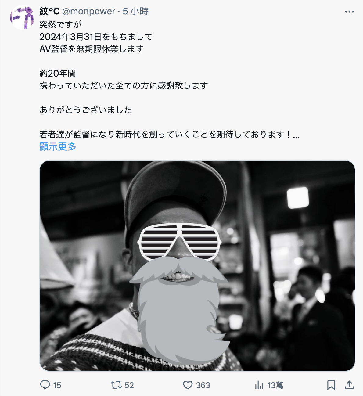 我簡單翻一下他的發文,為什麼是簡單翻?因為紋℃也只是簡單寫,他說雖然事出突然,但他決定自4月起無限期休業不做AV導演了,非常感謝大家在這20年間的幫忙,也期待年輕的監督能開創新時代ー