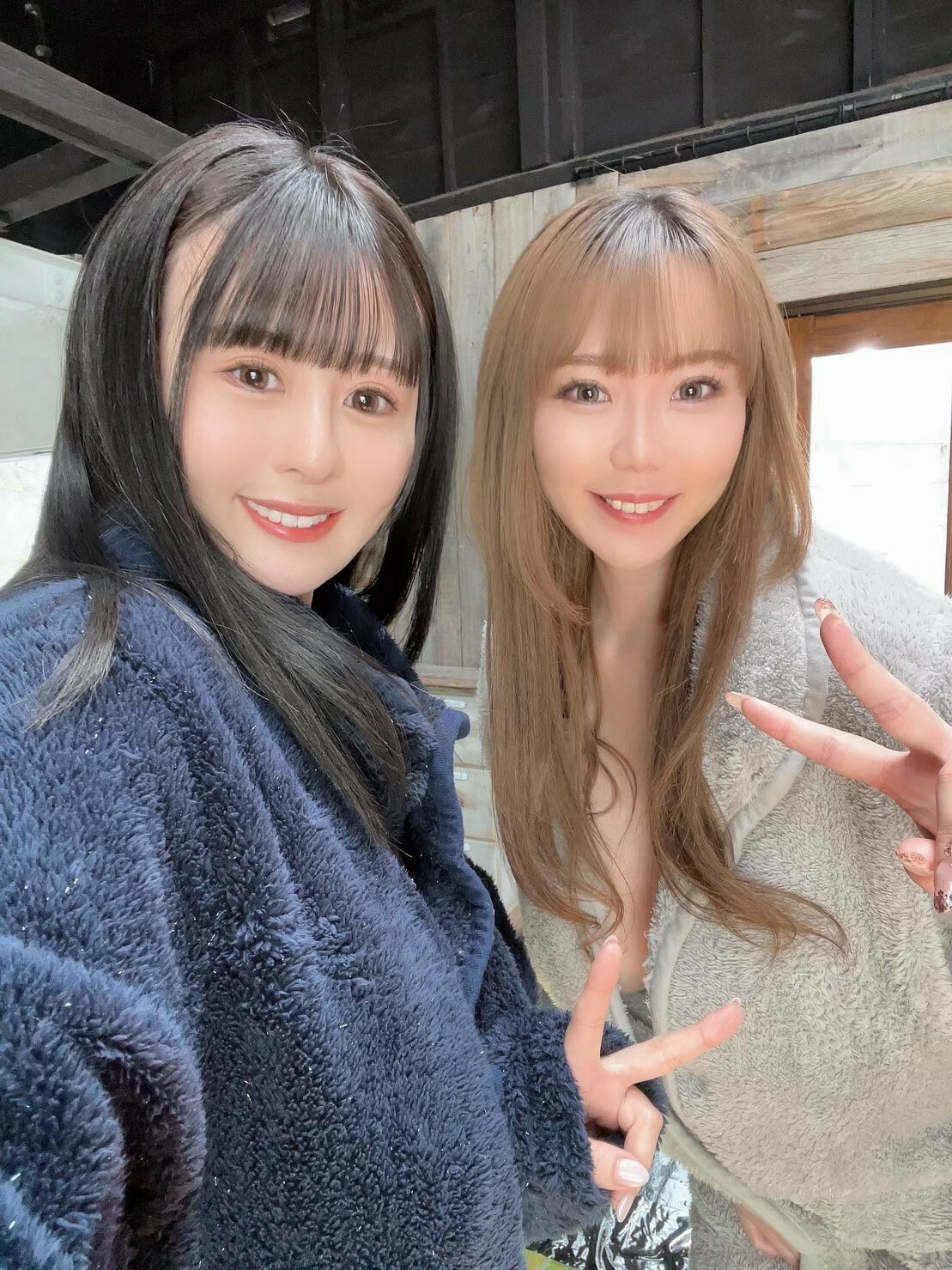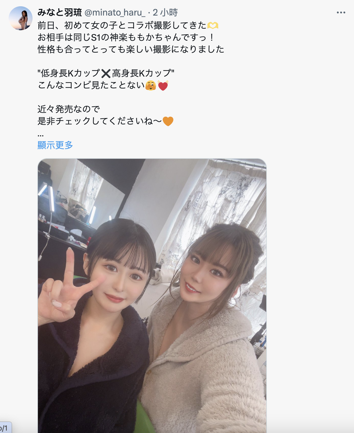 幹,不管主導這企劃的是誰,他就是我大哥,瞧みなと羽琉(湊羽琉)是怎麼寫的?除了兩人很合得來、攝影的過程很愉快外,這還是個「低身長Kカップ✖️高身長Kカップ」、兩位女優都是K罩杯的組合ーみなと羽琉(湊羽琉)這樣講完全沒錯的,因為她的資料設定是175公分(實際上稍微矮一點,但有170公分是沒問題的),神楽ももか(神樂桃果)則是156公分高,雖然在AV界這身高也不算矮了,但和みなと羽琉(湊羽琉)的組合就是天龍地虎,重點是兩人都K罩杯,真是峰峰相連到天邊: