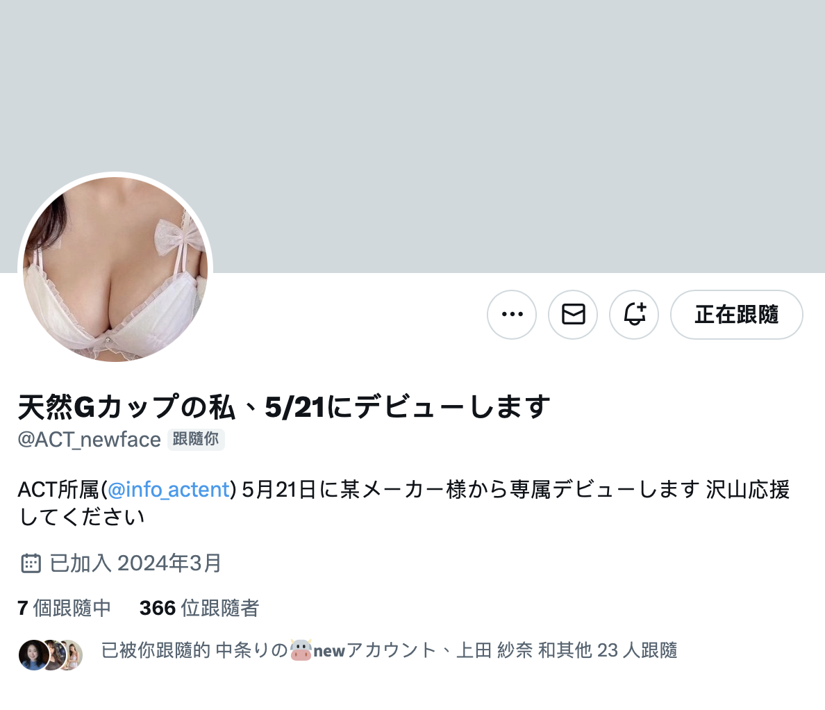 經紀公司ACT昨天讓這位「天然Gカップの私、5/21にデビューします」(天然G罩杯的我,將會在5月21日出道)註冊了X的帳號(https://twitter.com/ACT_newface),目前已經有了超過350個追蹤者〜
