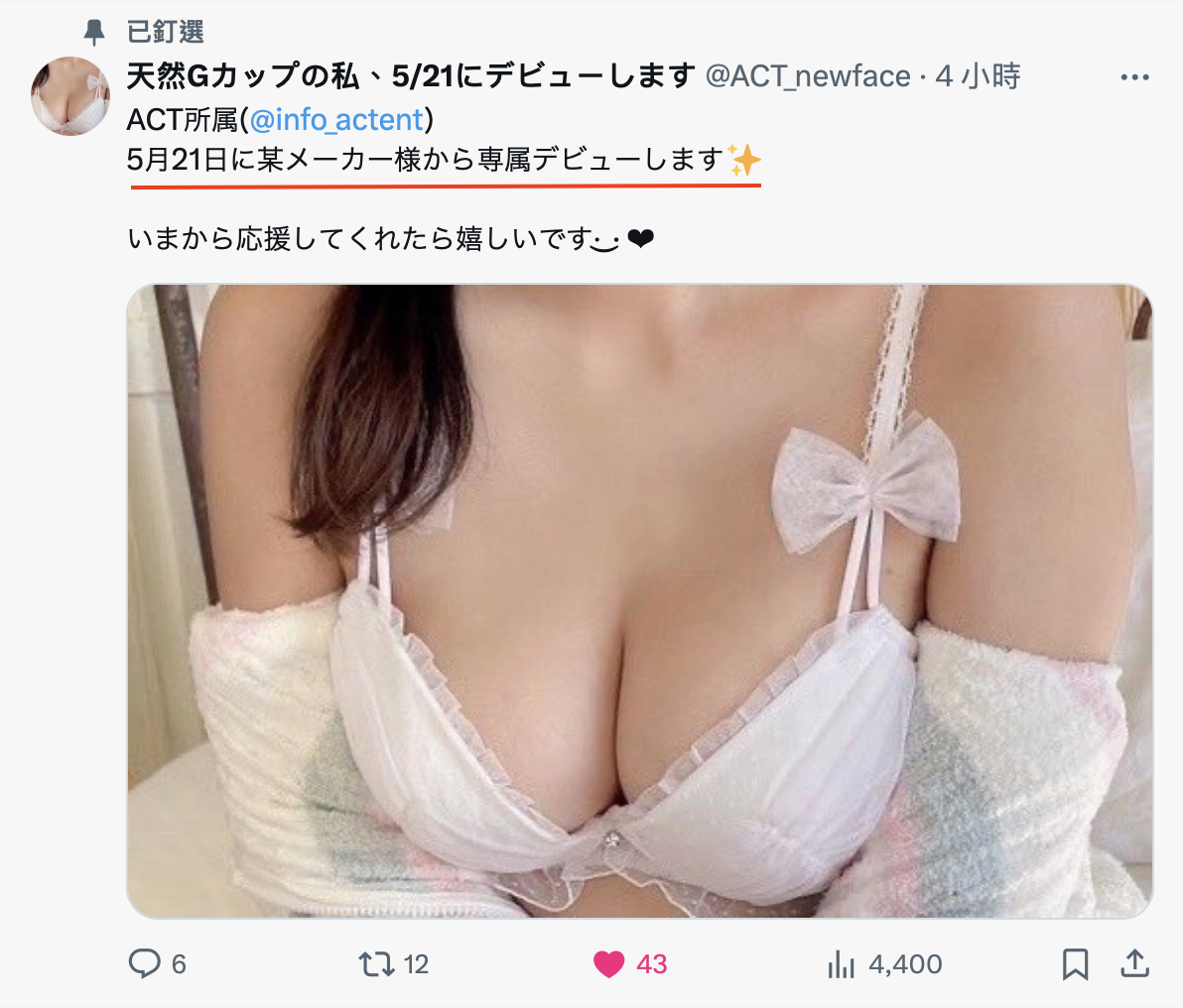 這麼做有什麼用意?首先當然是提前展開宣傳,如果能在情報解禁前拿到5000-10000個追蹤那就成功了,同樣在出道作情報解禁前就有了X的春陽モカ(春陽萌花,https://twitter.com/haruhi__moka)於發片大爆發的同時有了超過6000個追蹤就相當不錯;再來,提前曝光新人的賣點,這位女優不用說,就是「天然Gカップ(天然G罩杯)」的大奶;最後也是最重要的是提前宣布自己的身份,她會在5月21日出道,而且,還是專屬女優(専属デビュー):