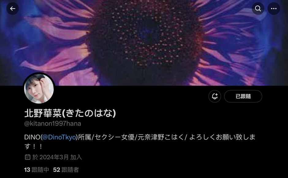 比方說這一位「北野華菜」,她在X的自我介紹欄(https://twitter.com/kitanon1997hana)寫得很清楚了,現在她是事務所Dino的人,也就是香水じゅ了(香水純)、明日見未来以及滝冬煇(瀧冬煇)的學妹,然後她之前的藝名是「奈津野こはく(奈津野琥珀)」:
